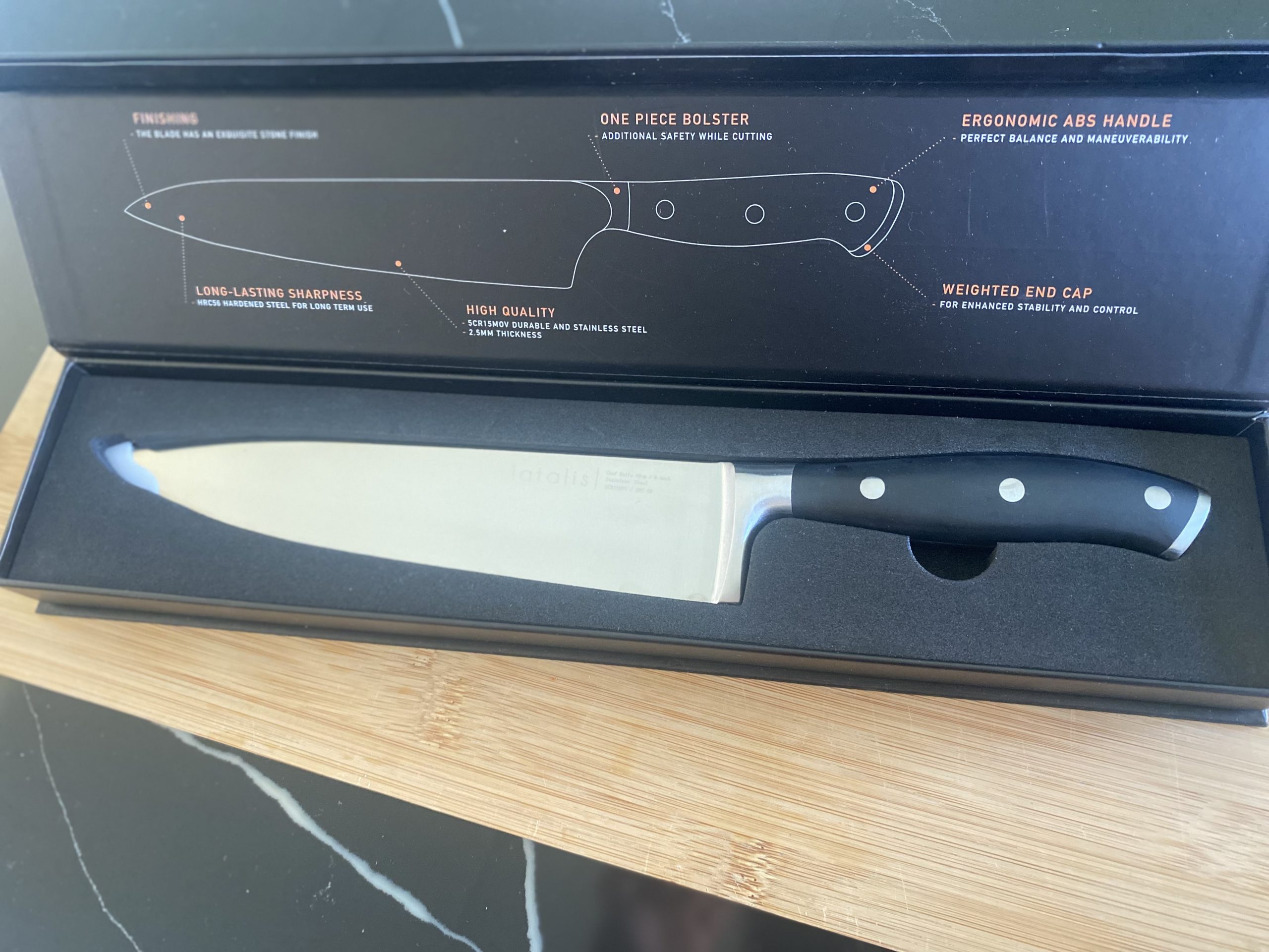 Toen ik benaderd werd door Latalis voor een review van hun mes zei ik direct ja, dit was namelijk voor mij de uitgelezen kans om verplicht te snijden met een echt degelijk mes. En wow wat een verschil zeg. We hebben natuurlijk ons messen set wel maar ik merkte direct verschil. Het mes van Latalis snijdt als boter overal doorheen, ligt licht in je hand en ziet er prachtig uit. Elegant maar ook stoer, het past goed bij onze keuken vind ik zelf. Het mes word geleverd in een geschenkbox dus is ook nog eens leuk als cadeau te geven.
