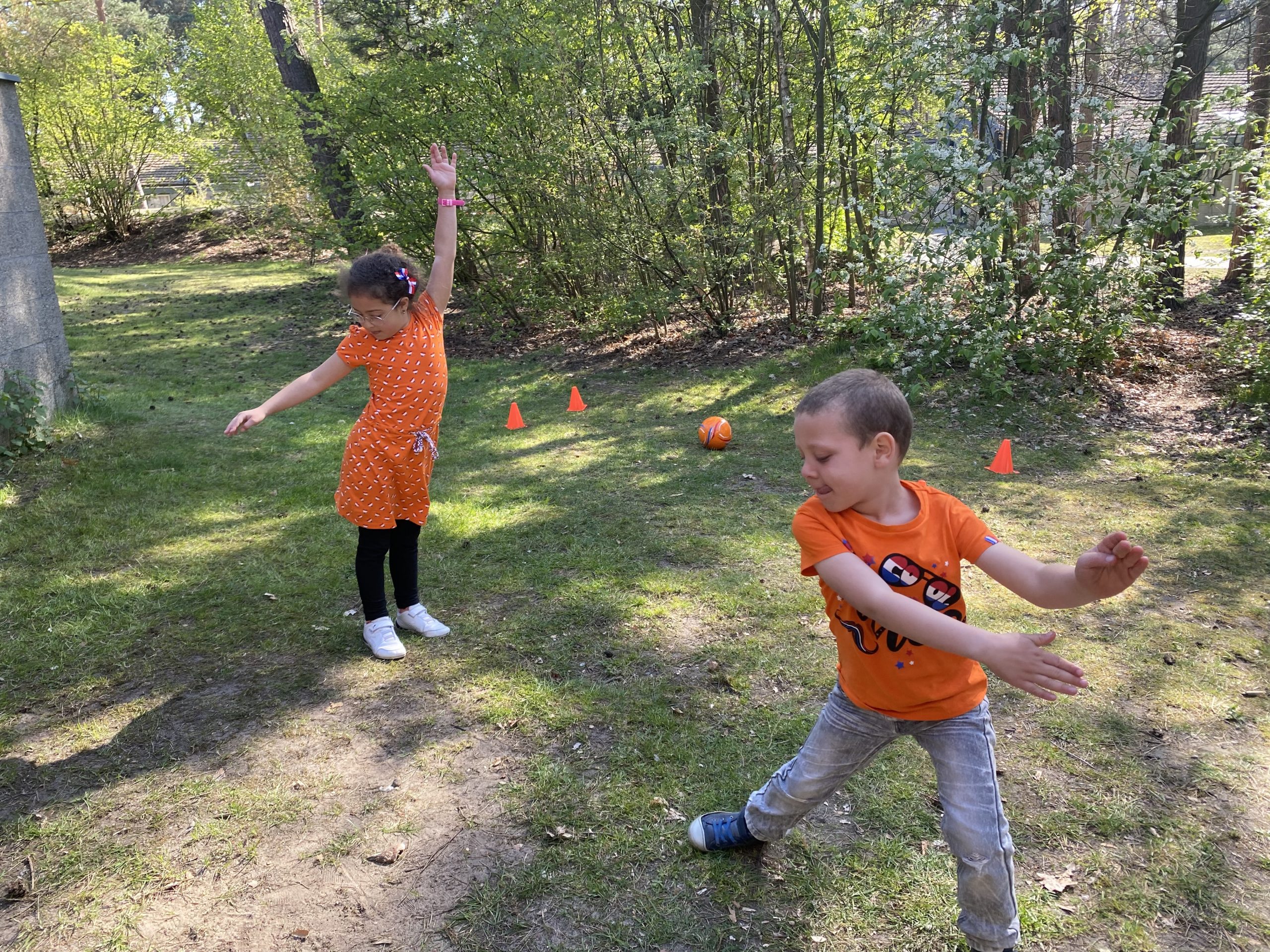 Wanneer je alles hebt verstopt kun je de kinderen erbij roepen en aan de slag gaan. Je legt het verhaal uit en vraagt ze of ze willen helpen. Natuurlijk willen ze dit maar al te graag. Na 2 raadsels volgt een groepsspelletje. Vanwege de koningsdag combineerde ik dit met spelletjes in de tuin.